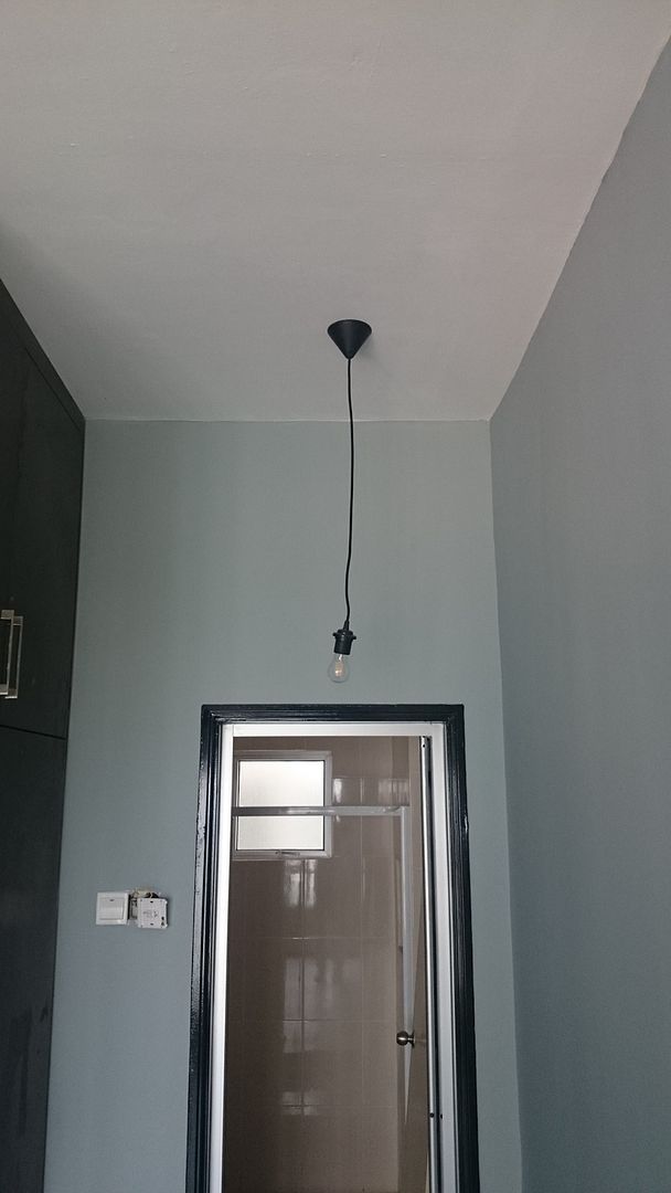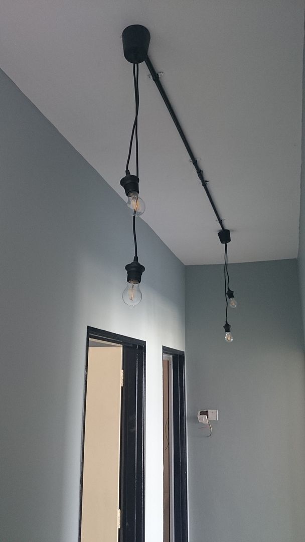 走廊就是这样吊灯泡吧了.其实理想的是三粒灯泡,但没预算~~~所以减到两粒 但我也是调整了高度.我调到两粒灯泡一样的长度,因为我不喜欢看到有电线的影子.