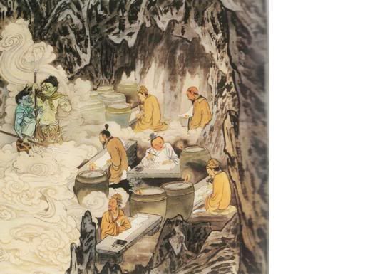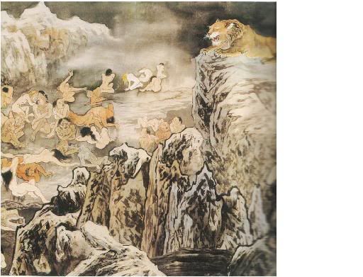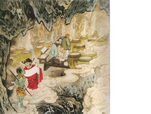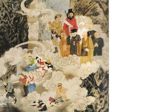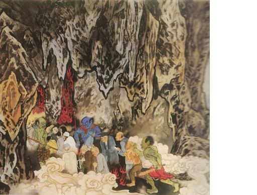 迷朦光中,几个青面差使,押解一批罪犯,在寒铁山洞穴中穿梭而过。这批罪犯,个个衣冠楚楚,看得出其生前之显赫与荣耀,从服饰穿著来看,有不同的阶级与地位;有的应该是政客,有的应是掌有权位的学者,在他们的神色之间,依然残留几分得意与跋扈。孱杂人群中也有宗教人士、神职道侣,享尽人间一切福报,辜负众生之供养。此时个个神情凝重,似乎已嗅到“大事不妙”的气息。 |