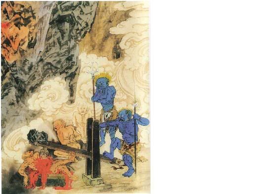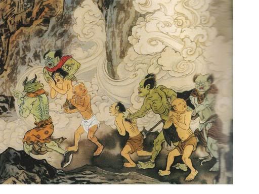 地狱之中,随时可见成千上万夜叉厉鬼,血口钢牙,眼如电光,利爪如钢铁,钳制罪犯,押解拖曳至各大小地狱。