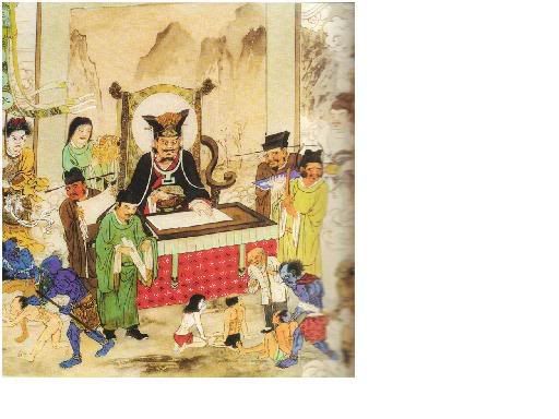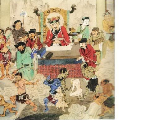 楚江王殿光明正大,司掌活大地狱。堕此罪犯多是违伦常、乱法纪、造业无数、至死不悔之恶徒。如在阳间,欺骗大众玩弄法纪导致灾难,或利用权位,巧取豪夺,吸民膏脂;或符咒惑人,谋人财产;或拐诱少年,逼良为娼;或组恶质帮派,走私贩毒,鱼肉乡民;或诈赌坑人、非法骗婚、伪造证券、贩卖伪药、扰乱秩序、危害健康等等。此殿判案严明,按罪分发上、中、下之狱,随业轻重,各受其报,或一处报或多处报,乃至十六处之多。此殿设有火柱、铁床、钢叉、剑叶、犁地、鞭挞、斫截、寒冰等小地狱,个个刑罚严酷,无不悲惨难熬。 |