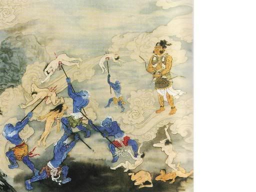 又有罪人习嗜杀生,手段狠毒残酷,或以弓箭枪弹,或刀叉戟矛,或射、或杀、或刺、或剁;或以核子生化武器,毒杀众生;或以圈网捕杀禽兽,以贩卖或啖食。以上种种罪人常受此戟腹抛空地狱罪报。时有千百夜叉厉鬼,口牙如剑眼似电光,其状凶恶,手执钢戟,或刺透耳目,或穿口鼻,或戳穿腹背,或抛向空中翻滚再以钢戟刺接,或丢置火床煎爆,或喂铁汁。业报无有终时,永不超生,是谓无间地狱。 |
