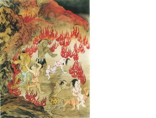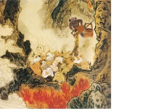 前有寒冰狱,此有火炼处。此处铁山万仞,四面环绕,周围数千里,一片火海,不毛之地,称之为:“饿鬼地狱。”堕此地狱罪魂,生前尽是悭贪吝啬之人,虽拥万贯资产,依然滴水不舍。如今堕此地狱,落得骨瘦如柴,双目如铃,肚皮空大犹如泄气皮袋。这些罪魂,因贪而饥,因悭无福,嗔怒哀号而喷烈火,其状可怖,又称之:“焰口地狱。”即使大慈大悲观世音或地藏王菩萨,前来施食拯救,多因贪嗔无福,张口欲食,烈火已将食物烧烬,呼天抢地,又能奈何呢?