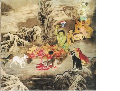 经云:“心业画师,自业画作。”如是因,如是果,怨谁呢?厉鬼现出你生前残酷模样,手执利斧支解你的身体,四周狼群环伺,垂涎等待,不正是你自己感召来的! |