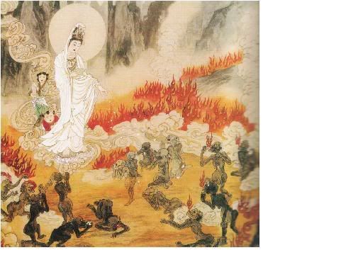 其中亦有极微数罪魂,或在过去生中,偶随人诵读经典,或称念佛号,此时感念菩萨施舍,心起刹那善根,合掌称念经句或佛号,顿时嗔火熄消,可享施食。若心起欢喜,持续称念不辍,随即可以超生。呜呼!一旦堕入焰口狱,浩翰嗔海烈火身,能起一丝清净心,谈何容易,微乎其微啊! |