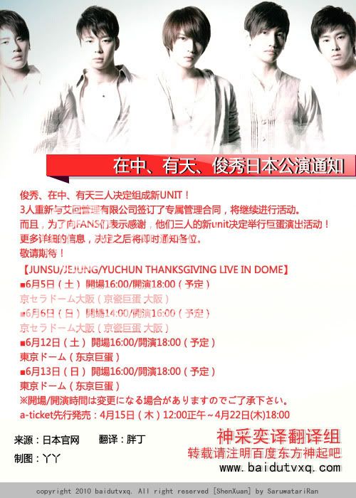 今天艾回公布了在中、有天、俊秀组成新的Unit将在日本的大阪和东京召开演唱会的消息。