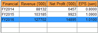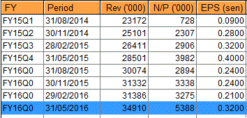 | | | Current Year Quarter | Preceding Year Corresponding Quarter | Current Year to Date | Preceding Year Corresponding Period | | | 31/05/2017 | 31/05/2016 | 31/05/2017 | 31/05/2016 | | | RM '000 | RM '000 | RM '000 | RM '000 | | 1 | Revenue | 40,694 | 34,910 | 112,405 | 97,628 | | 2 | Profit/Loss Before Tax | 8,015 | 6,433 | 20,392 | 16,170 | | 3 | Profit/(loss) attributable to ordinary equity holders of the parent | 5,955 | 5,388 | 14,938 | 12,001 | | 4 | Net Profit/Loss For The Period | 5,955 | 5,388 | 14,938 | 12,001 | | 5 | Basic Earnings/Loss Per Shares (sen) | 0.34 | 0.34 | 0.86 | 0.75 | | 6 | Dividend Per Share (sen) | 0.00 | 0.00 | 0.00 | 0.00 | | | | | As At End of Current Quarter | As At Preceding Financial Year End | | 7 | Net Assets Per Share (RM) | | | 0.4000 | 0.4000 |
