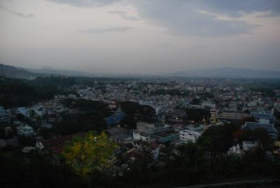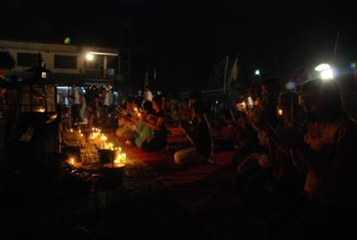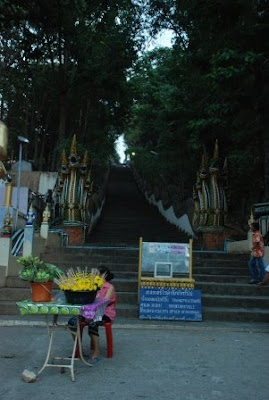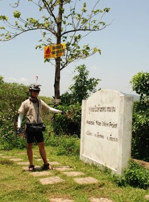 听说这天是泰国的卫塞节,也就是佛陀诞生日,为了见识当地的庆祝活动,我们特地踏到城外四公里的一所庙宇,都已八九点了,庙里只有普通的拜祭活动,爬到山头倒把金三角的全景一览无遗。
