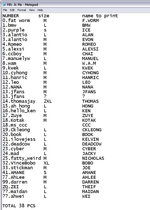 OK! 这样我也买..21 JESS拿了, 我就拿33 M SIZE name to be print - JOE stickman 发表于 19-11-2010 13:55