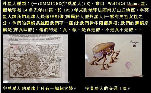 1. UMMITES(宇莫星人)(善意度+8): 來自 Wolf 424 Ummo星,距地球有14多光年[1]遠,於1950年來到地球法國南方山丘地區。宇莫星人跟我們地球人長像很相像(同屬於人型外星人)一樣有男性女性之分。他們的邏輯系統跟我們不一樣(比我們還多兩個選項),我們的邏輯系統是[非真即假],他們的是:真,假,是真是假,不是真不是假。