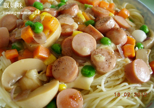 看到玉米粒下面的吗?那就是cheese片哦~放在烫好的面上,把酱汁淋下去~~~(我自己那份没有放cheese,我已经够月巴了!) @@