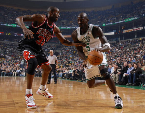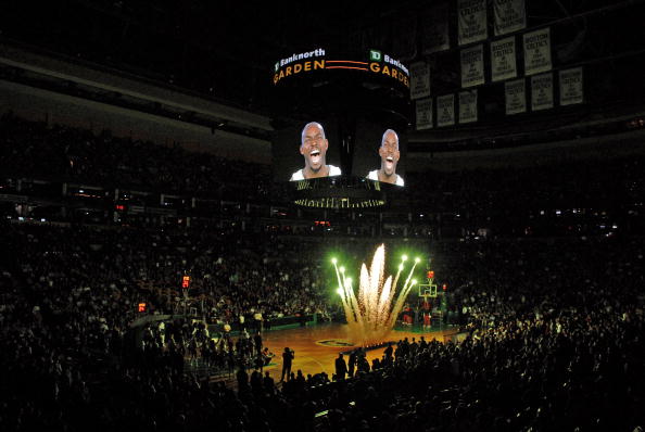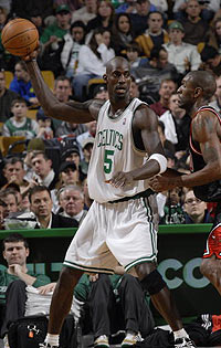 凯尔特人队首发阵容:拉加-兰多、雷-阿伦、凯文-加内特、保罗-皮尔斯、肯德里克-帕金斯。