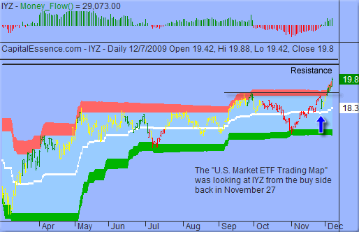 下面的图形来自于我们的“美国市场ETF交易地图”,显示了IYZ和标普500指数的交易区间和资金流向指标。如图所示,淡蓝色带代表短期交易区间,向上突破这一区间意味着超买(红色色带所示),向下跌破这一区间意味着超卖(墨绿色带所示)。