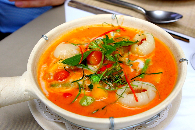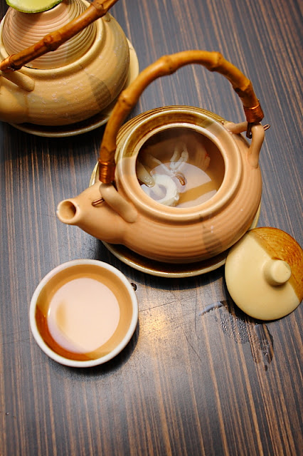 开餐前他们端上一人一壶海鲜汤暖暖肚子打底
