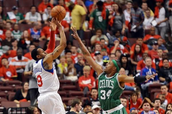 比赛开始后,回到主场的76人队攻防两端的强度都胜过了客场,开场就取得5-0的领先,比赛打了将近3分钟后凯尔特人的加内特连得4分才打破球队的得分荒。内外开火的76人很快在比分上10-4领先,不过朗多连续的突破率领凯尔特人完成8-0的攻势反超比分,76人立即用9-2的攻势还击,整个凯尔特人队只有朗多保持着进攻火力,个人连得9分支与整个76人周旋。前6次投篮都打铁的皮尔斯在首节还剩1分31秒的时终于完成一次2+1,个人连攻7分帮助凯尔特人将分差缩小到2分,但是76人队的威廉姆斯命中压哨三分球,76人队33-28领先,朗多首节8投5中砍下13分。
