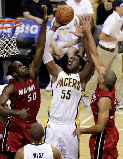 四节具体比分为(热火在前):26-17,17-26,12-26,热火:詹姆斯22投10中,贡献22分和7个篮板;韦德13投2中,贡献了5分和5个篮板;安东尼10分。步行者:希尔20分,希伯特19分和18个篮板,格兰杰17分,韦斯特14分和9个篮板。