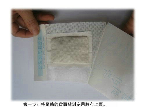 1、首先清洁皮肤表层,将排毒精华包印字的一面贴到贴片的中央位置,透气孔一边则紧贴于肌肤上,每天睡前将排毒养容贴贴于足底(睡觉时身体平躺循环加快效果最好),8个小时后或第二天早晨起床时除下,再以纸巾擦拭或以清水冲洗皮肤。(固定透气贴片在撕去时不会感到疼痛)