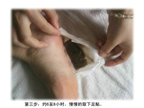 每天贴一次(觉前贴,起床后拿下)两只脚同时各贴一片,坚持每天使用,效果分三个阶段显现。