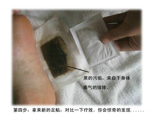 3、使用足贴后,袋中粉末吸出废油、废液等毒素而变成油黏状,并从白色变至褐色或黑褐色,说明身体中毒素已被排出。健康状况较差时,颜色较深,也会有较多水分或油脂排出。