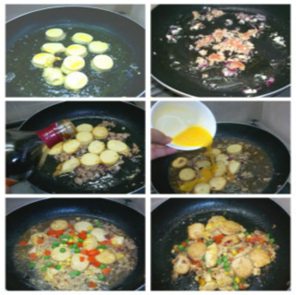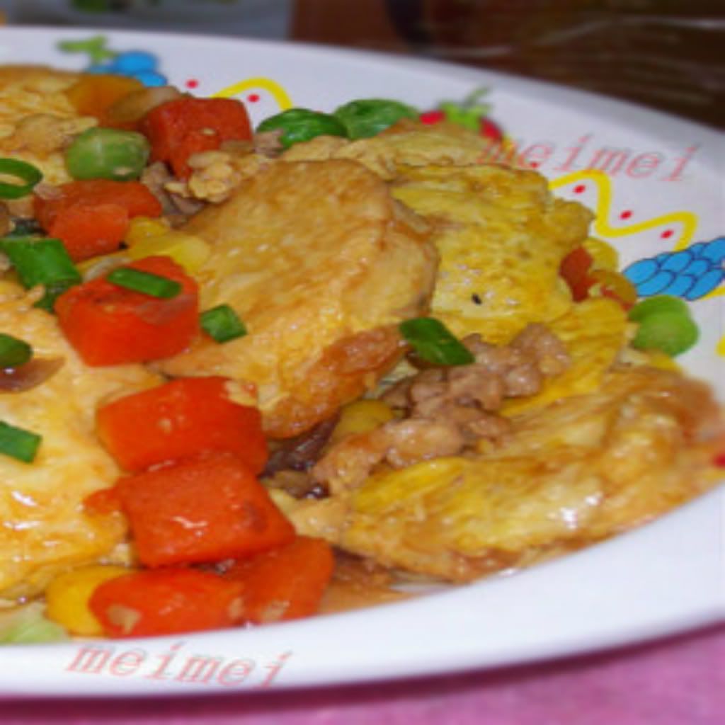 原料:玉子豆腐 鸡蛋 葱 蒜米小葱 什锦豆 做法: