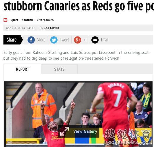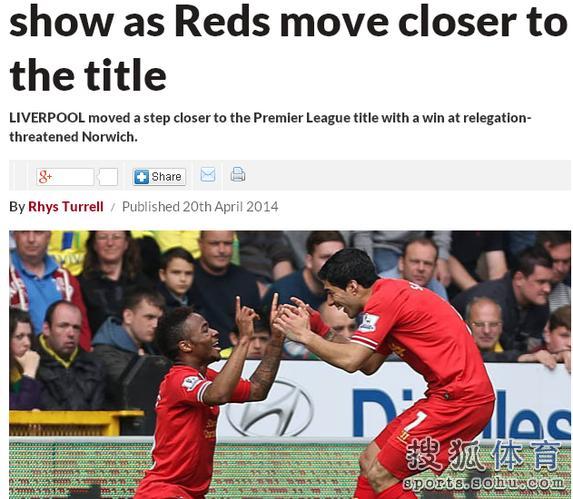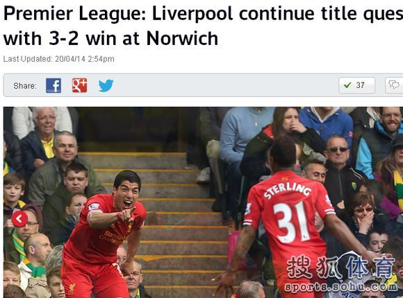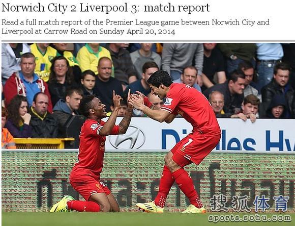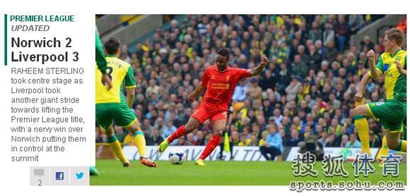 “斯特林和杰拉德的进球早早让利物浦看到了获胜的希望,可是诺维奇在最后阶段也让红军非常紧张。罗杰斯的球队连续两轮比赛3-2赢球,上轮他们以同样的比分拿下了曼城,在切尔西和曼城连续犯错的情况下,利物浦距离英超冠军已经越来越近,目前他们领先第二名的优势已经达到5分。”