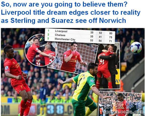 “斯特林和苏亚雷斯的进球帮助利物浦取得了对阵诺维奇的胜利,如今,你终于相信他们可以夺冠了。利物浦在10分钟内就轻而易举的取得了2球领先,对于红军而言,这是一个无价的胜利,阔别24年的英超冠军近在眼前,当然他们将诺维奇踢进了深渊。”