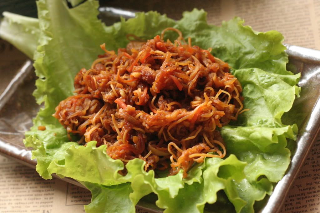 1。将材料准备好,放油热窝,把蒜米炒香,加入肉碎,番茄, 大葱, 炒熟它,然后加调味料,上碟备用。