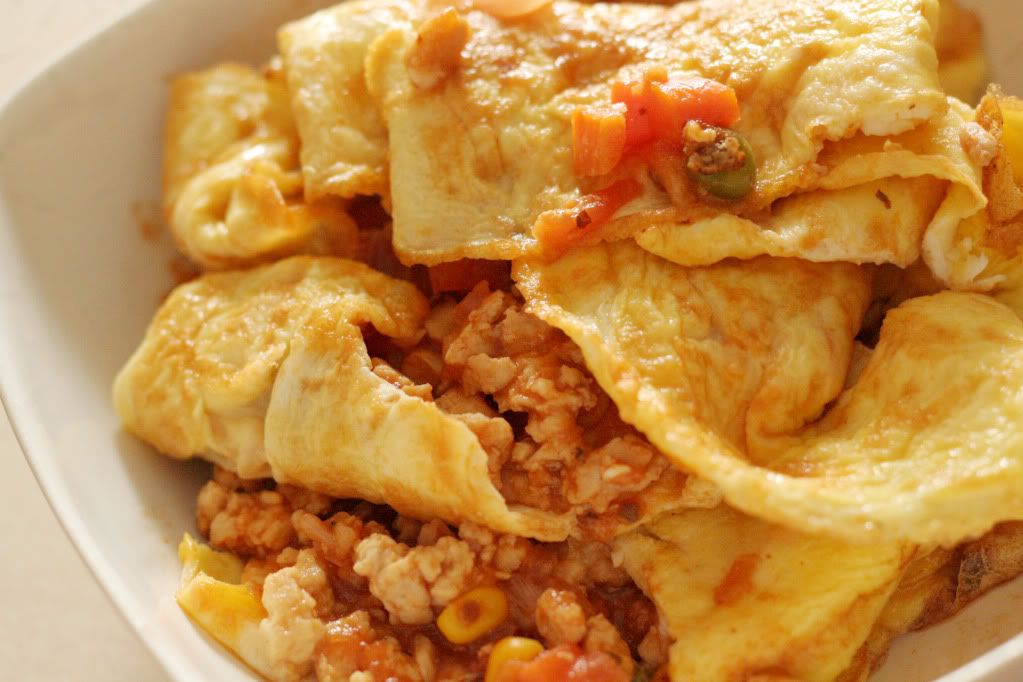 2。将蛋液加入CORNFLOUR搅打均然后小火煎熟,然后放刚才炒好的料下去,再用蛋包起来就可上桌。