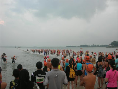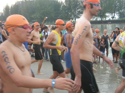 比赛出发前大家互相鼓掌鼓励鼓励一下,然后鸣声一响,就冲着向海跑去了。橙澄澄的人头在海里跳动,场面蛮壮观的。然后我们的组别就开始进入隔离区准备开始了。和朋友互相鼓励一下,一声响,大家就冲啦。跑进海里,到水深抵达腰部的时候,就开始要划水游泳了。