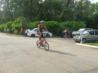 赶紧冲过300米的沙滩,越过冲洗区,脸部朝水冲冲让脑袋清醒一下,再快点找小红的停靠处吧。把衣服穿上、把头盔戴上、把鞋子穿上,喝一点生理盐水再咬几口power bar,气息还没有调顺,就推着小红赶紧开始跑了。过了检测站,跳上小红就狂冲出去了。这个是漫长的路线啊,大概有一个小时半的时间,应该可以慢慢调整呼吸,我那时候这样想。那时候看到的出发时间是8点20分。