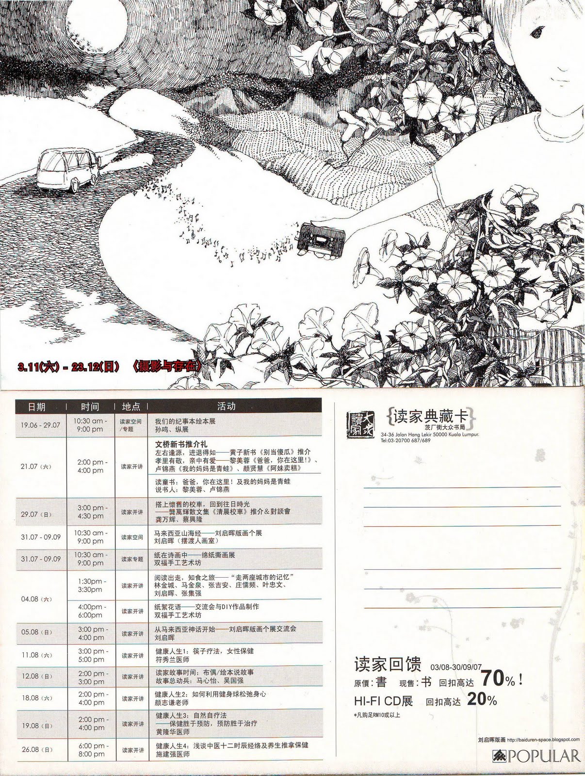 毕业迄今很久没有去大众了,以前那边有些什么:“读家典藏卡”,前面都有很精美的手绘的,后面一般放活动表,旁边有位子写地址和贴邮票,可以当作明信片有的。我有一些…… 不知道这些卡是否可以拿来寄出去?刚刚看了日期,是2007年的…… |