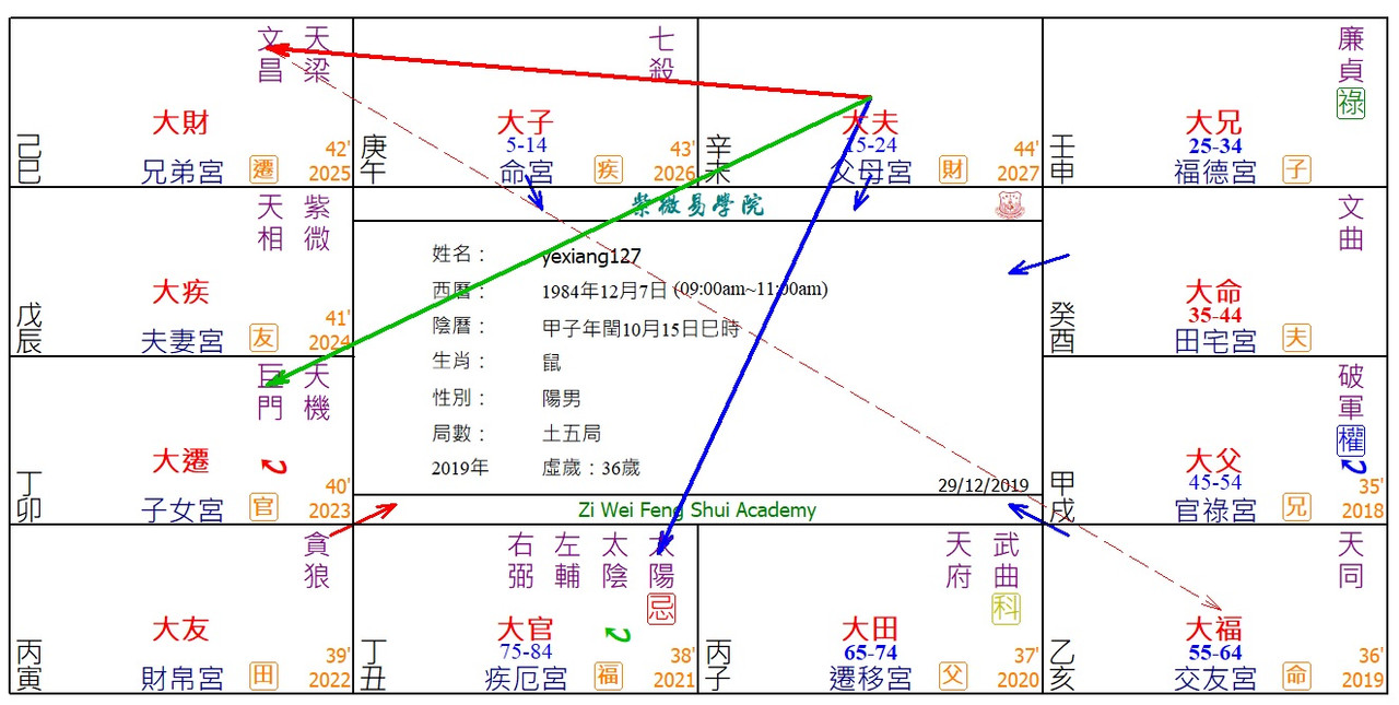 阁下现在虚年31岁,大限官禄(26-35岁的事业状态)位于子,重叠本命福德宫,有一个流出忌,见廉贞星,可是却化禄权去本命的田宅三合位,表示阁下这10年的事业压力大、可是业务增长、工作量增加之类的,应在2016、2017、2018、2020、2021。 基于阁下大限财落在辰,重叠迁移,有一个贪狼自化禄,表示这10年的财属于”远外得财“,例如离乡背井、跑动、外勤等,意思是说如果阁下在外面跑动越频密,赚钱的能力就越多,然后化权入交友,化忌入田宅宫冲子女,没有看到阁下的财有大破。