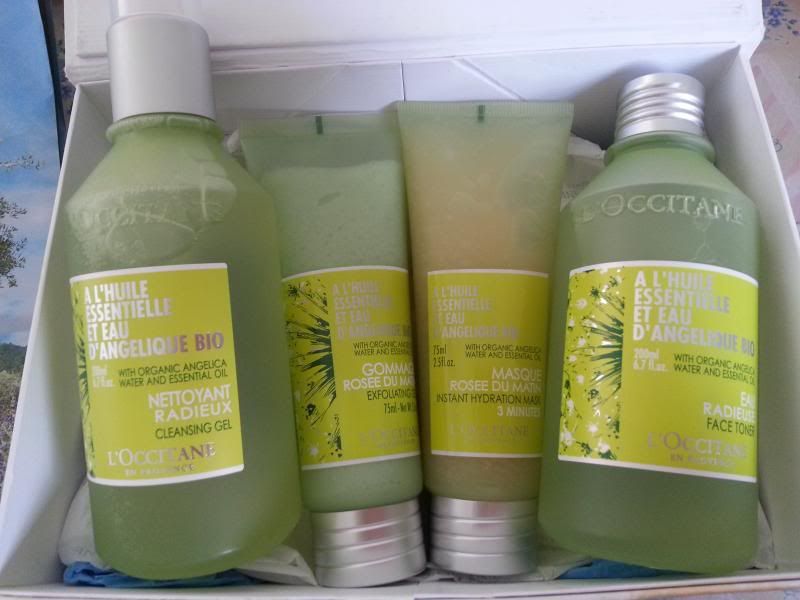 然后,上星期跟同事去逛kl,走到farenheit的l'occitane里,她要买护手霜,我当时没有东西想买的。但看到angelica set有做promotion,手痒痒买了1 set然后做member. 那时候看到买上450, 550 就有送很多free gift. 当时的我,却压抑自己不要乱花钱,不然这个月要吃西北风了。