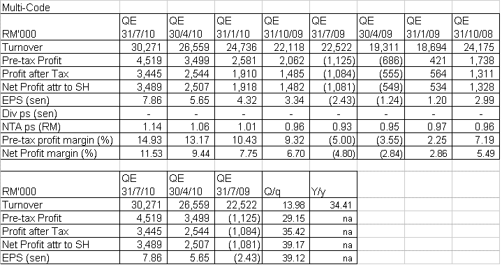 | 7004 MULTICO MULTI-CODE ELECTRONICS INDS | | Quarterly rpt on consolidated results for the financial period ended 31/10/2010 | | Quarter: | 1st Quarter | | Financial Year End: | 31/07/2011 | | Report Status: | Unaudited | | Submitted By: | Lee Wee Hee | | | | Current Year Quarter | Preceding Year Corresponding Quarter | Current Year to Date | Preceding Year Corresponding Period | | | 31/10/2010 | 31/10/2009 | 31/10/2010 | 31/10/2009 | | | RM '000 | RM '000 | RM '000 | RM '000 | | 1 | Revenue | 23,726 | 22,118 | 23,726 | 22,118 | | 2 | Profit/Loss Before Tax | 2,438 | 2,062 | 2,438 | 2,062 | | 3 | Profit/Loss After Tax and Minority Interest | 1,712 | 1,485 | 1,712 | 1,485 | | 4 | Net Profit/Loss For The Period | 1,769 | 1,482 | 1,769 | 1,482 | | 5 | Basic Earnings/Loss Per Shares (sen) | 3.98 | 3.34 | 3.98 | 3.34 | | 6 | Dividend Per Share (sen) | 0.00 | 0.00 | 0.00 | 0.00 | | | | | As At End of Current Quarter | As At Preceding Financial Year End | | 7 | Net Tangible Assets Per Share (RM) | | | 1.1819 | 1.1421 | | | | | N/A |