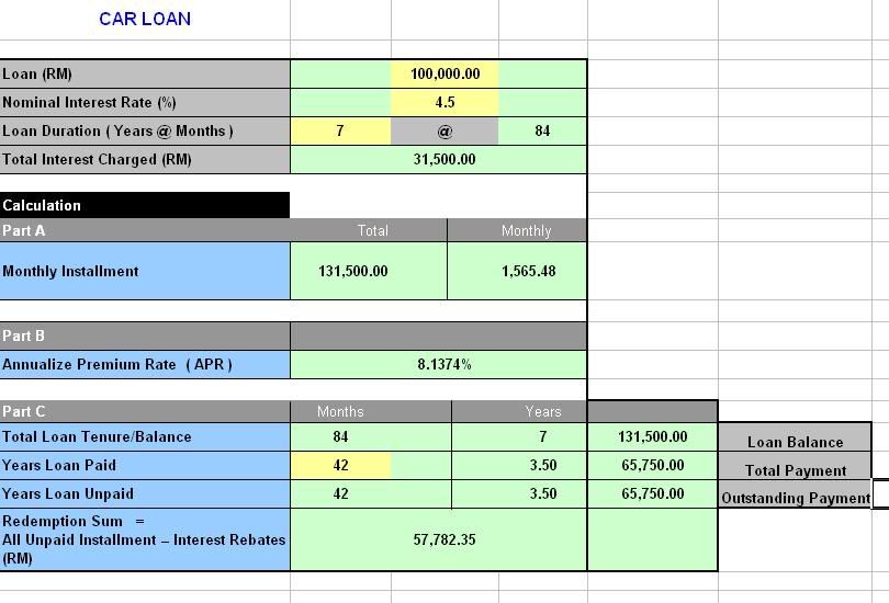 做个Loan RM100000 利息4.5% 供七年的 Example : 来睇 |