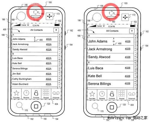 根据过去几周公布的苹果公司专利显示,苹果公司一直在研究如何进一步改进移动设备的用户界面。其中,两个专利图显示苹果将在未来的iPhone及类似移动设备上增加运动感知功能,同时iPhone 3G用户朝思暮想的前置摄像头也终于出现。