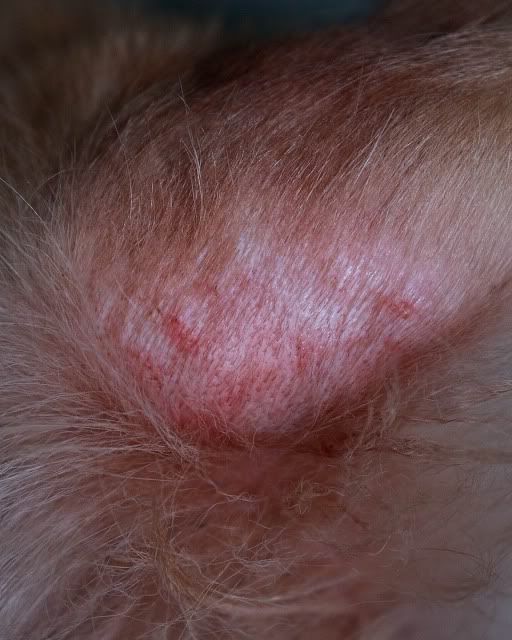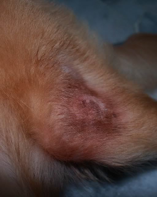 Magtox其实是一种常用于牛或的羊,通常农场兽医在清洗完伤口之后都会spray类似的药来防止感染。其实用在狗狗和猫猫我觉得都ok,问题在于包装上只注明是草药(herbal),而没有清楚的说明它的主要成分(active ingredient).如果它是有刺激行的话,接触到了狗狗的皮肤就会有刺痛的感觉(和人一样),所以当你下一次要再帮狗狗spray的时候,狗狗当然会很抗拒,就好像小时候我们小时候吃苦药一样。从你的照片看来,比较像是霉菌感染。 |