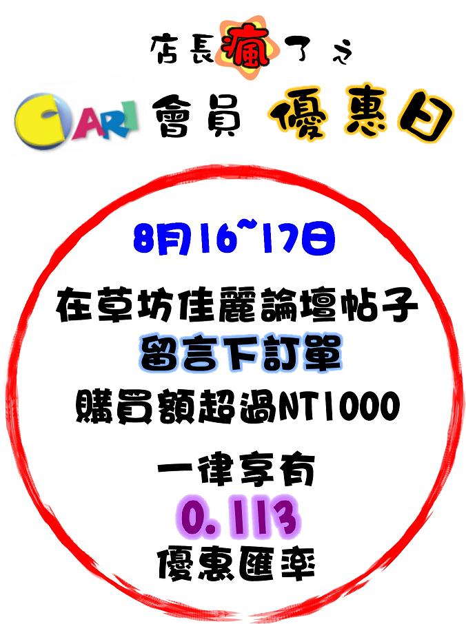 ◆草坊 ◆Cari 論壇賣場開幕優惠~ ♥首5位成功下訂單者以0.115優惠中♥ 名額有限,要買要快哦!!!