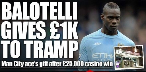 上周末20岁的曼城前锋与布莱克本射手桑巴一起去赌场消遣。据《太阳报》透露,去年夏天以2400万英镑从国米转会曼城、周薪10万英镑的巴洛特利,只要在曼彻斯特的大街上看到那些无家可归的可怜穷孩子,就经常会给予他们无私的帮助,而他最近一次的义举就发生了曼彻斯特的“235赌场”门外。