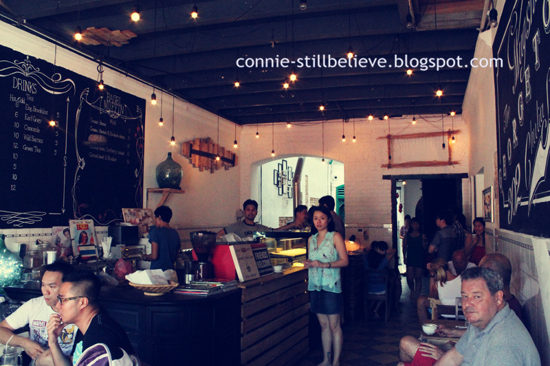 除了壁画,来到槟城这个美食天堂,寻找美食这个任务是一定要进行的。喜欢酸奶酪 (yogurt) 和百吉饼(先蒸后烤的发面圈) (Bagels)的朋友,可以到位于Chulian Street 的 The Mugshot Cafe 去尝尝。这个店本身就很有怀旧的味道。店里都是用木凳木桌子,就好像以前小学时学校里的桌椅一样。很特别,我很喜欢,撩起很多过往小学生涯的回忆。