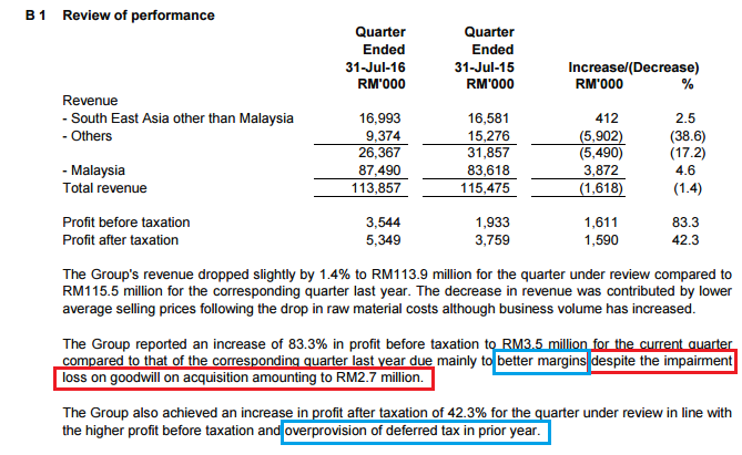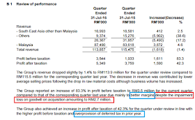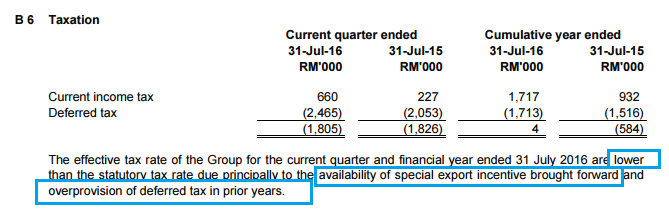 大家仔细留意的话,公司这个季度因为过去几年Overprovision of deffered tax获得了1.805 mil的Income tax回扣。这也是导致Net Profit比Profit Before Tax高的原因。此外,出口的Special export Incentive也是拉低税务的主因。