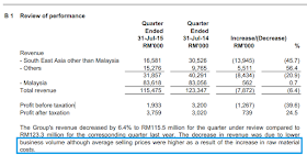 - 今天公布的盈利是3.321 mil,比上个季度下跌了2.98%,主要是因为营业额下跌。