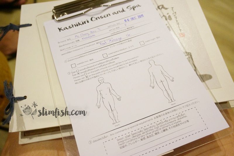 之前我们预约的时候就已经通知他们我们所选的配套了,所以泡温泉和按摩前员工有要求我们填写按摩时要注意和避免的身体部位。