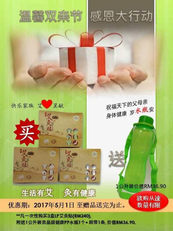 凡一次性付款RM240购买三盒艾灸贴,附送1公升装“食品级卫生安全pp水瓶(附肩带)”一个