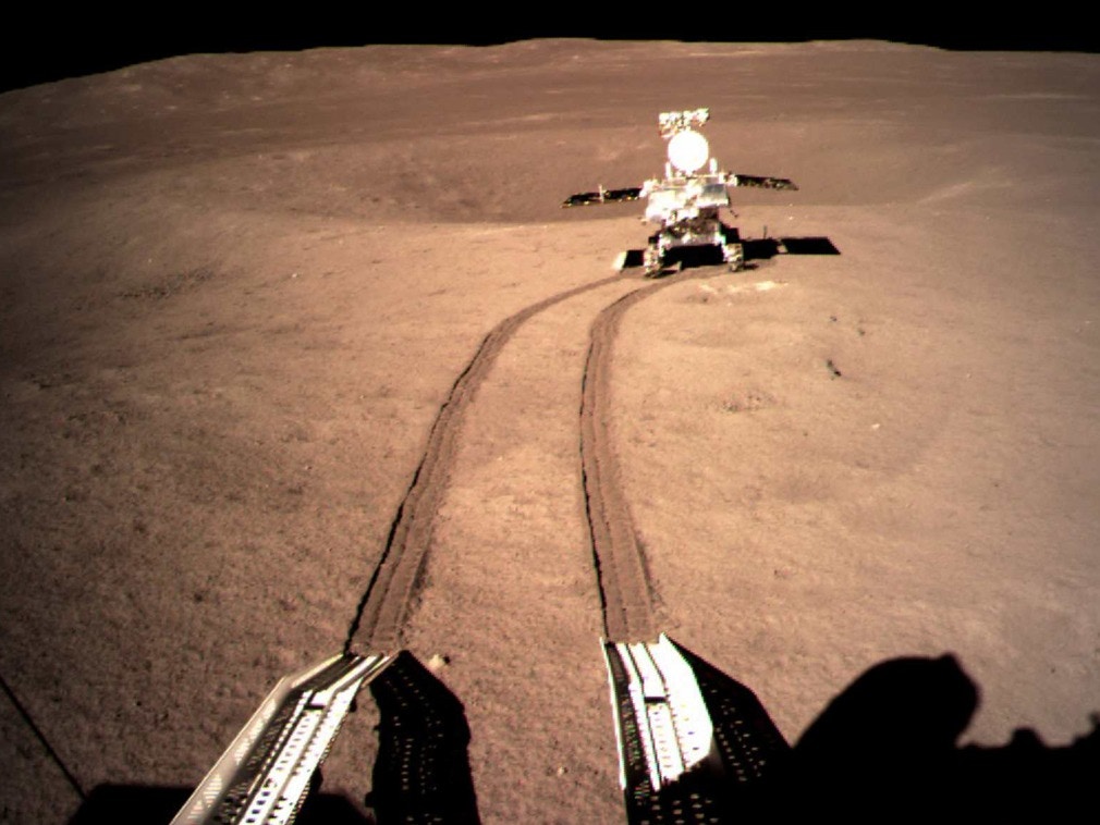 1月4日,着陸器相機拍下「玉兔二號」巡視器在月背留下的車輪痕迹。
