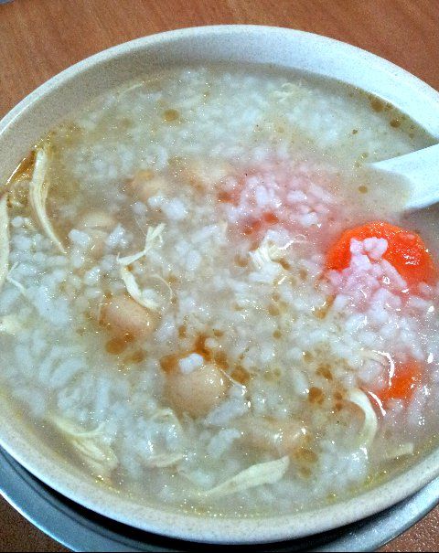 红萝卜,珍珠豆,鸡丝粥配腰豆,榨菜炒火腿。。。好吃!