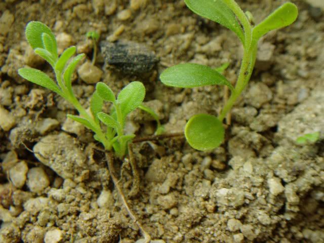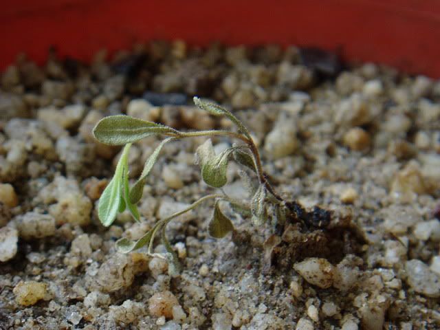 我不同时撒下三包种子,不同土质到不同角落,经过有和没有发芽和各种过湿过热过干虫害等等原因,最后只剩下这四株,我现在完全是隔开所有植物的放在房间窗前,半天冷气半天风扇的吹着它,希望他能存活下来,但他的茎真的很细,很单心!如果不成我会放弃以播种方式!实在太痛苦了~