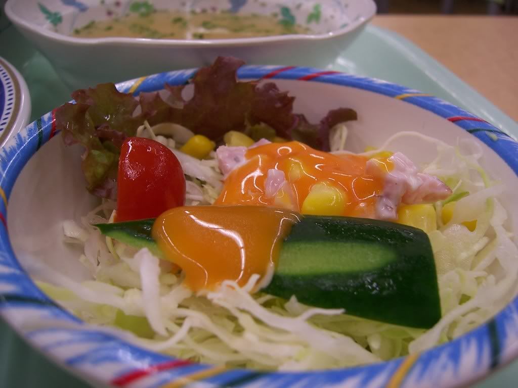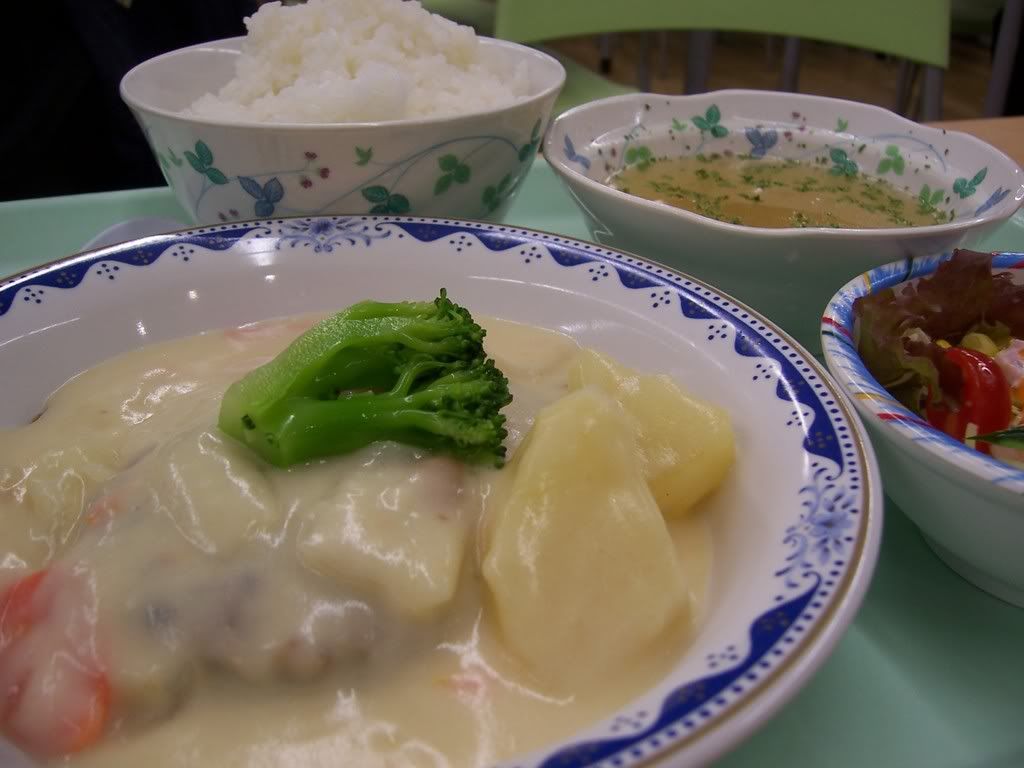 有一个晚上也是在食堂吃的“周替定食”,意思是指每个星期换一次菜单的杂饭之类的食物。