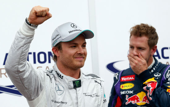 杆位的争夺,10位车手均是使用全新的超软胎登场,路特斯车队的基米-莱科宁是上路的第一人。红牛车队的维泰尔和马克-韦伯在第一轮试跑中占据前二,两人的圈速分别是1:14.333和1:14.726,奔驰车队的罗斯伯格和汉密尔顿三四,阿隆索第五。第二轮的冲刺,10人均换上了另一套全新的超软胎。三叉星双雄发力,罗斯伯格和汉密尔顿将超越红牛,将头排拿下。这是三叉星自中国站以来的连续第四个杆位,同时也是罗斯伯格个人的连续第三个杆位。红牛车队的维泰尔和韦伯三四,莱科宁第五,阿隆索仅列第六。佩雷兹,苏蒂尔,巴顿和维尔格尼分列第七~第十。