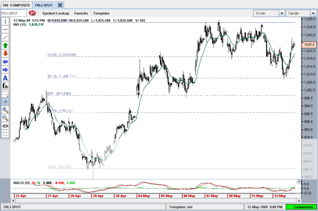 今天第一次做short在1010出师不利,没有等confrim signal sales short,支撑在38.2% 1008点反弹向上到closing 1025.5点,由于看空市场所以还没有卖,cut loss 在1037.... |