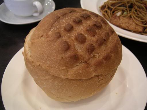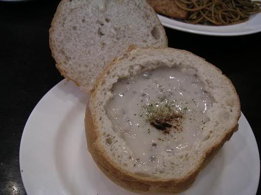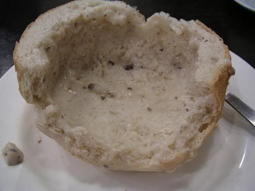 看到这个造型实在是很令人好奇,以圆形的烤面包盛载的蘑菇汤,一边吃汤,一边撕面包来点缀.